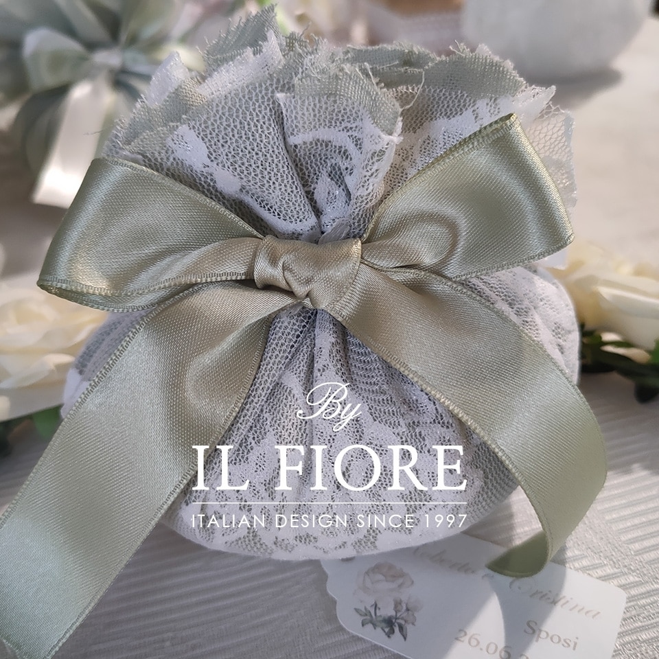 Bomboniera bon bon in pizzo e verde salvia , esclusiva, romantica con fiocco di raso. Una realizzazione elegante, originale ed esclusiva.