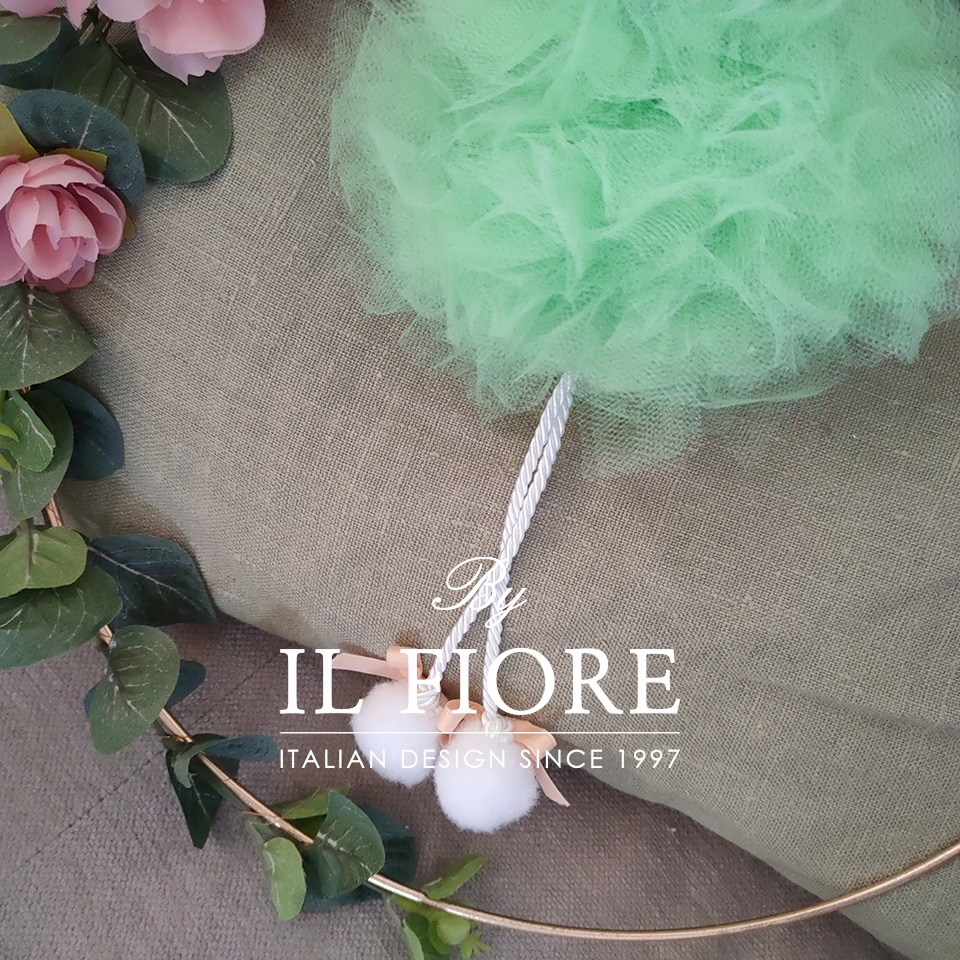 Bomboniera Cresima e Comunione bambola in tulle verde prato, confezionata con scatola, fiocco di raso e confetti alla mandorla.
