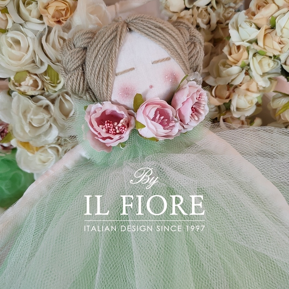 Bomboniera Cresima e Comunione, bambola in stoffa con vestito in tulle verde prato e fiori, cm 32.