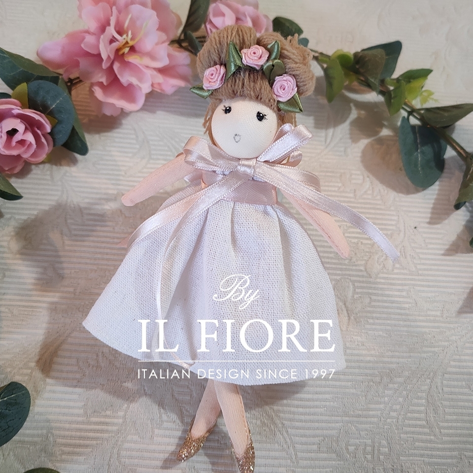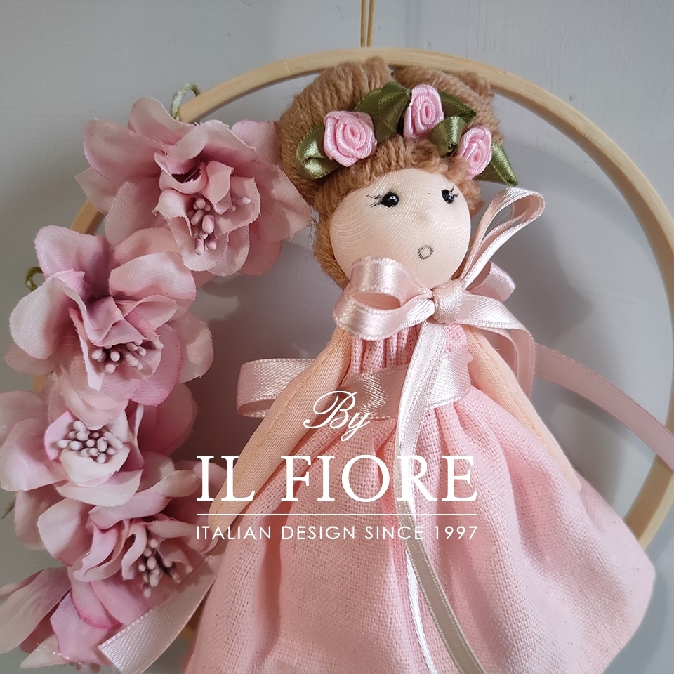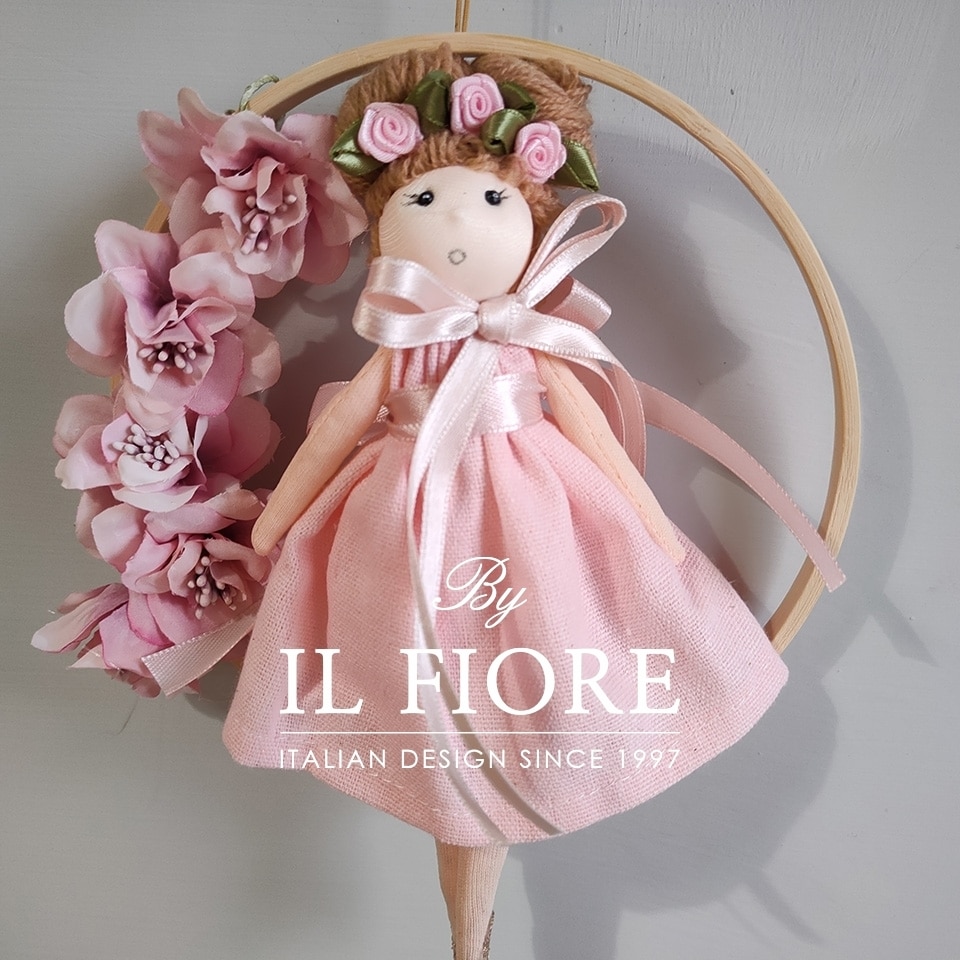 Bomboniera Cresima e Comunione bambola nuvola con vestito rosa e bianco, decorata con fiori e cerchio.