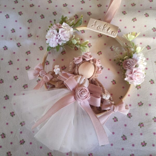Bomboniera Comunione e Cresima bambola con vestito in tulle bianco, decorata con fiori e cerchio.