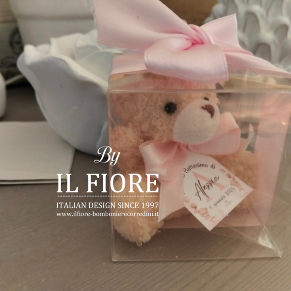 Bomboniere Battesimo bimba e bimbo orsetto calamita, decorato con tag personalizzabile con nome e data cerimonia.
