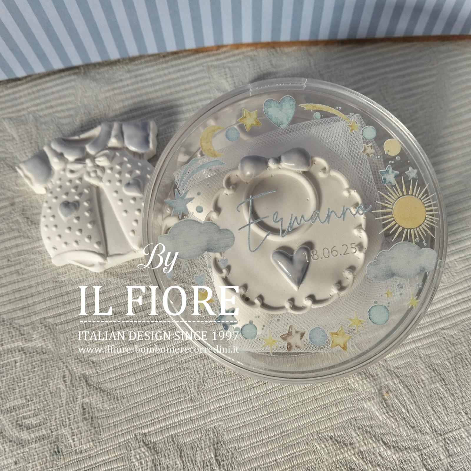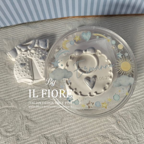 Bomboniera Battesimo bimba/bimbo. Questa dolcissima bomboniera รจ perfetta per il battesimo della tuo bebรจ. Si tratta di unaย scatolina tonda pensata per contenere i confetti, bavaglino e tutina con calamita. Il coperchio รจ personalizzato dal nome del bebรจ e data Battesimo.