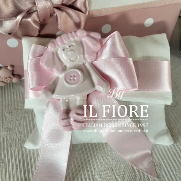 Bomboniera Battesimo bimba. Sacchetto busta grande con bambolina calamita.