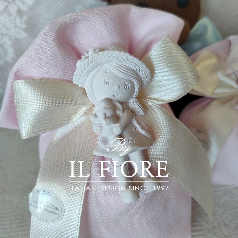 Bomboniera Battesimo in tessuto piquet con con bimba e fiocco di raso.