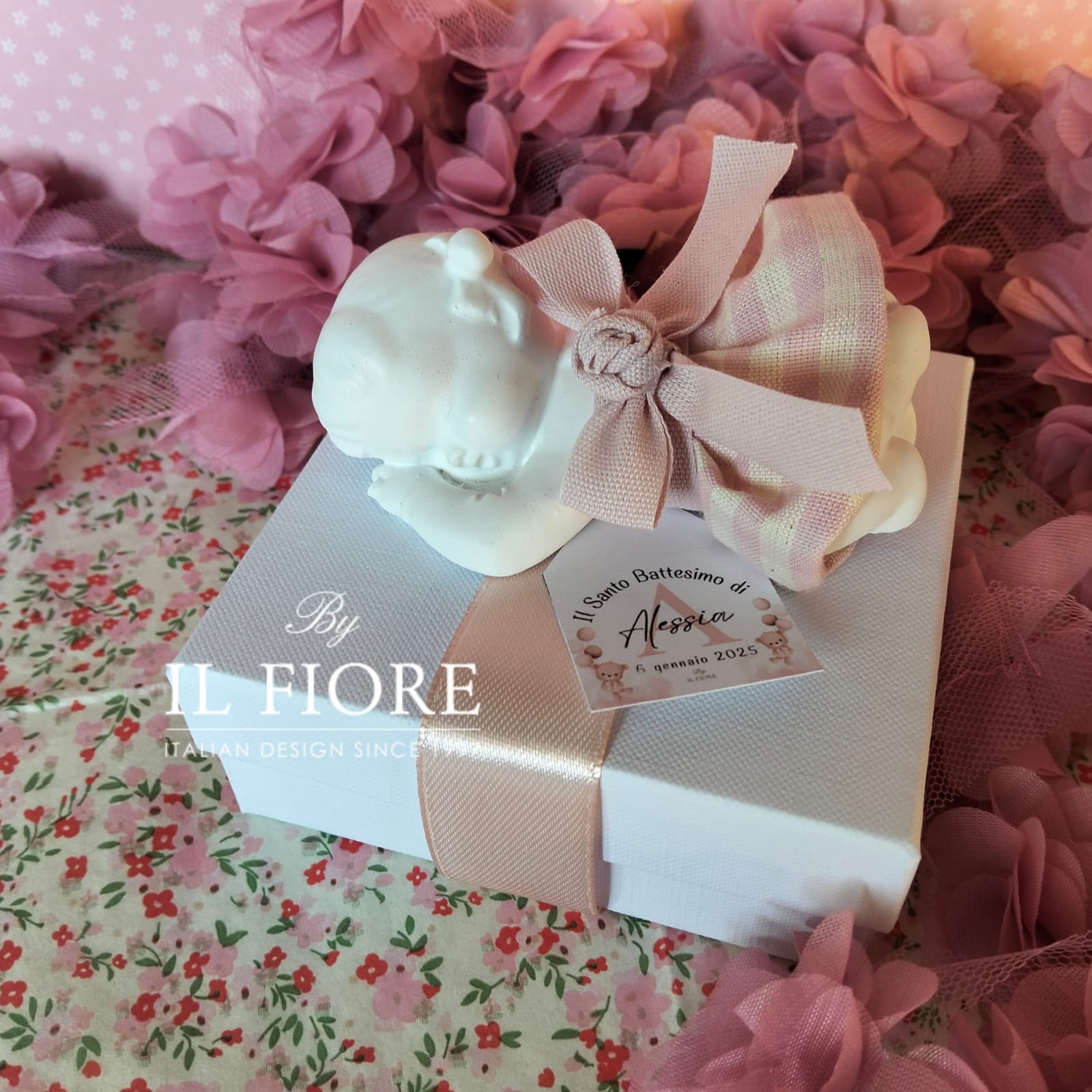 Bomboniera Battesimo. Questa raffinata e funzionale bomboniera unisce eleganza e dolcezza.