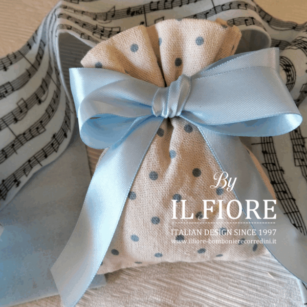 Bomboniera Battesimo sacchetto a pois decorata con calamita bimbo. INTERAMENTE FATTA A MANO.