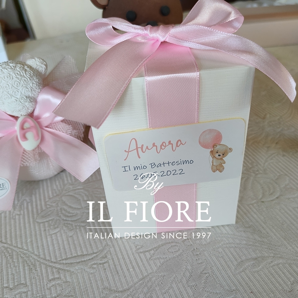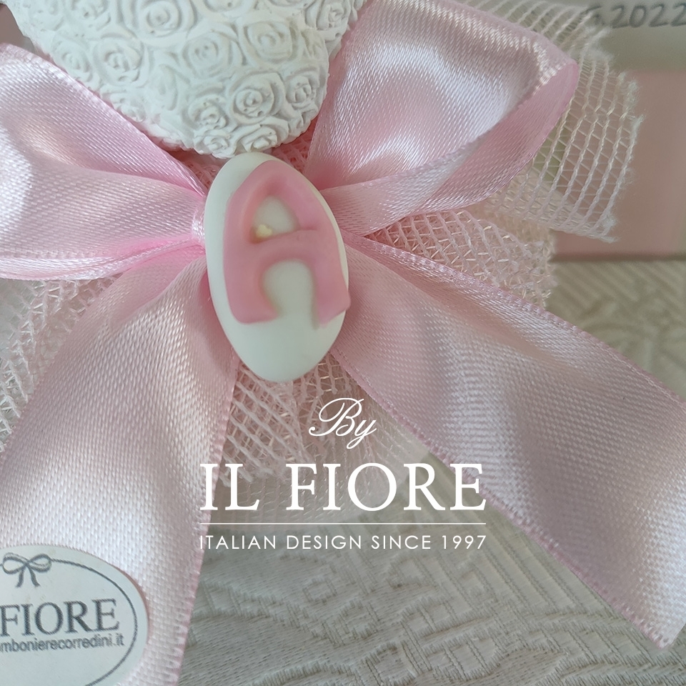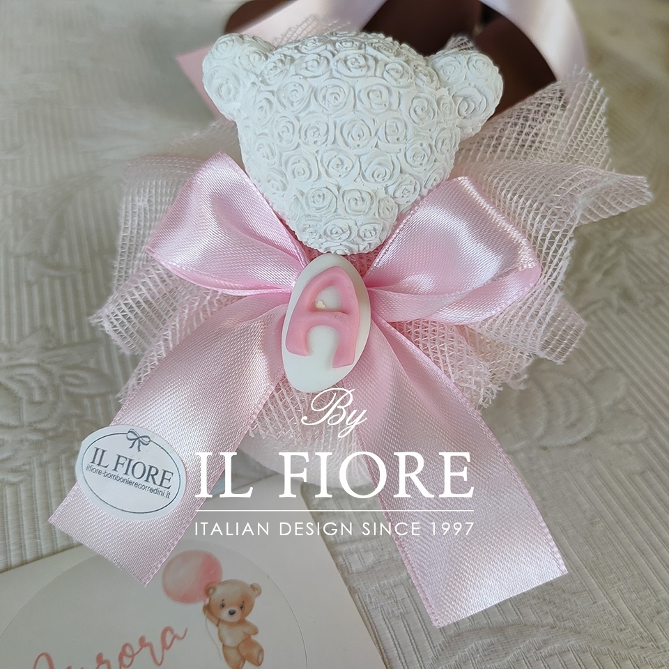 Bomboniera Battesimo con orsetto per bimbo e bimba in gesso profumato. La bomboniera è confezionata con ciuffetto e confetto decorato con lettera del bimbo.