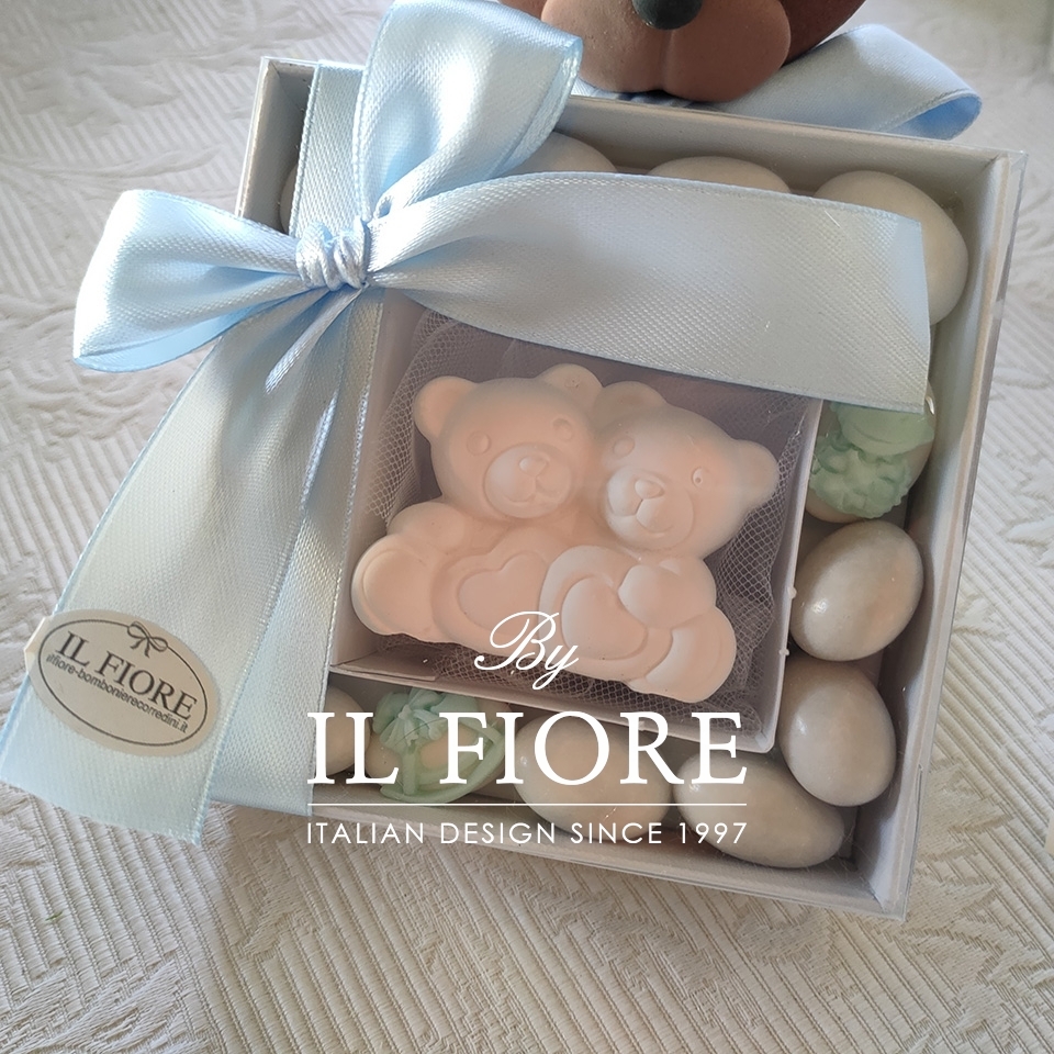 Bomboniera Battesimo scatola con orsetto in gesso, confetti decorati e bigliettino in omaggio.