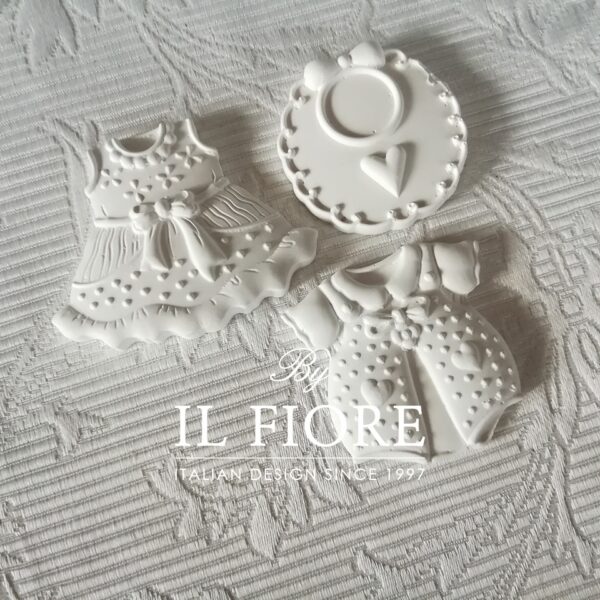 Bomboniera Battesimo bimbo e bimba in piquet con pizzo san gallo e gessetti profumati vestito, tutina e bavaglino per bimba, pagliaccetto, tutina e bavaglino per bimbo.