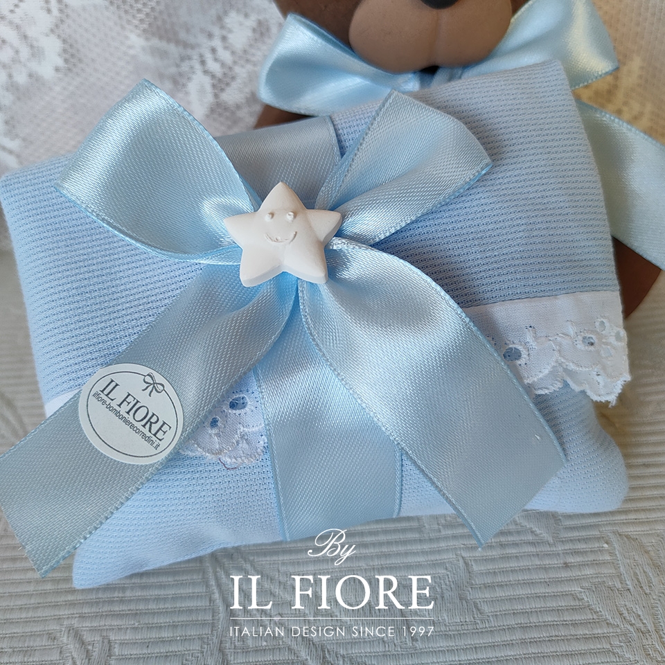 Bomboniera Battesimo sacchetto busta in piquet rosa o celeste con pizzo Sangallo, decorata con stellina.