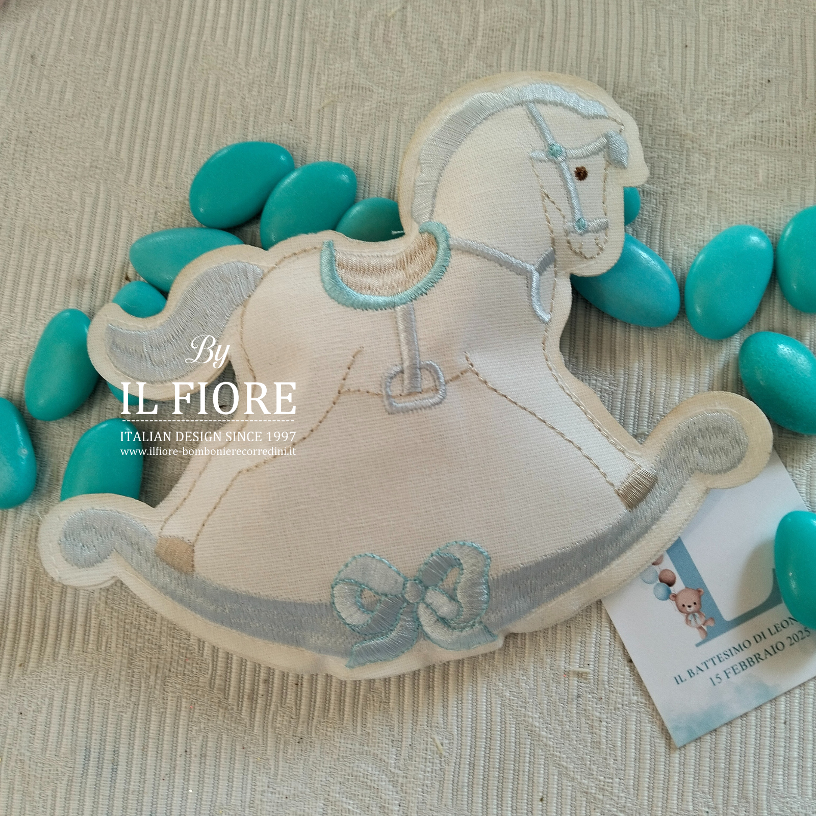Bomboniera per Battesimo bimbo sacchetto portaconfetti cavalluccio a dondolo. Raffinata e dolcissima bomboniera che ricorderà per sempre il tuo evento.