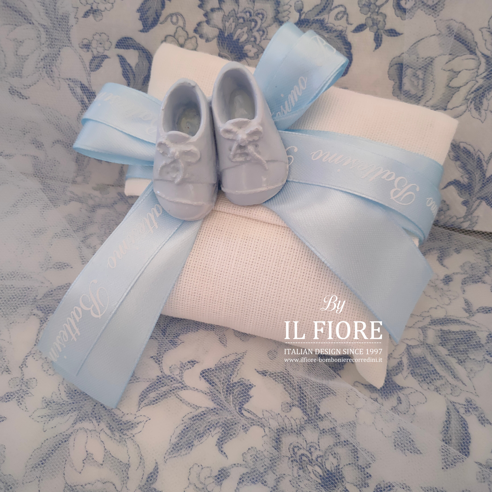 Bomboniera Battesimo bimbo sacchetto portaconfetti con nastro di raso e scarpette.
