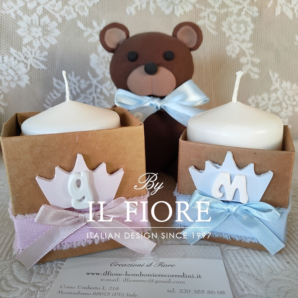 Bomboniera Battesimo candela bimba e bimbo, principessa e principino. La bomboniera è confezionata con scatola country nastro in cotone e fiocco di raso.
