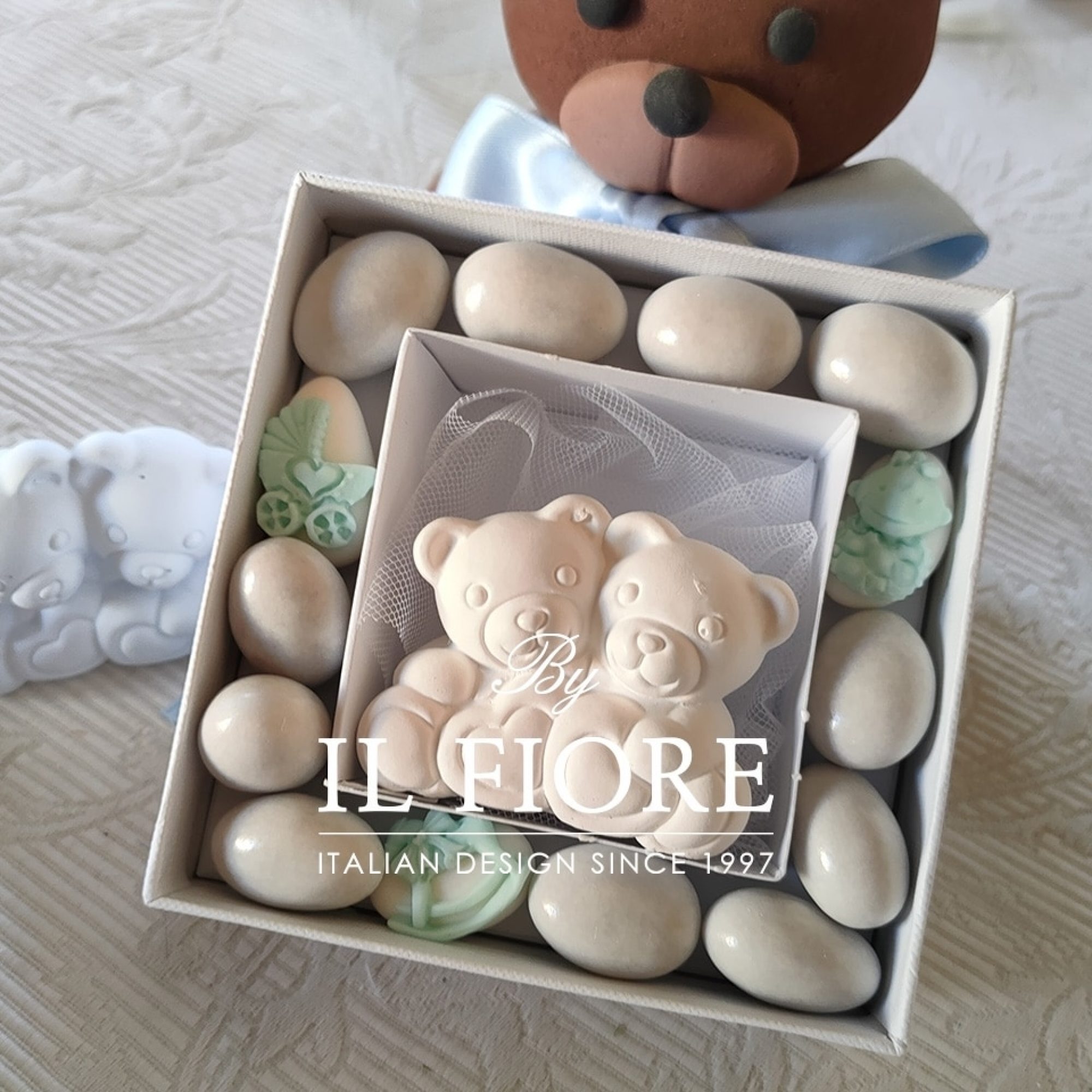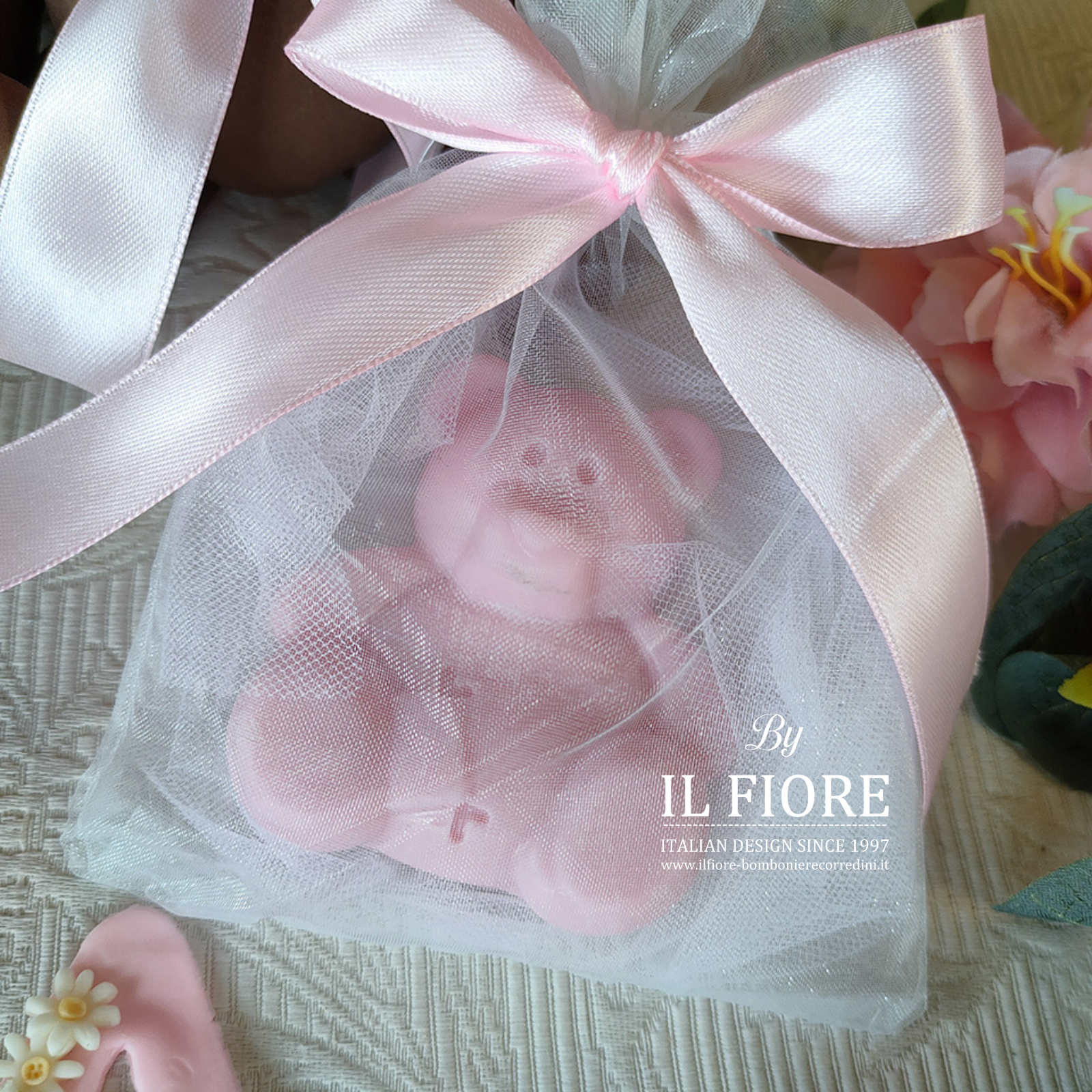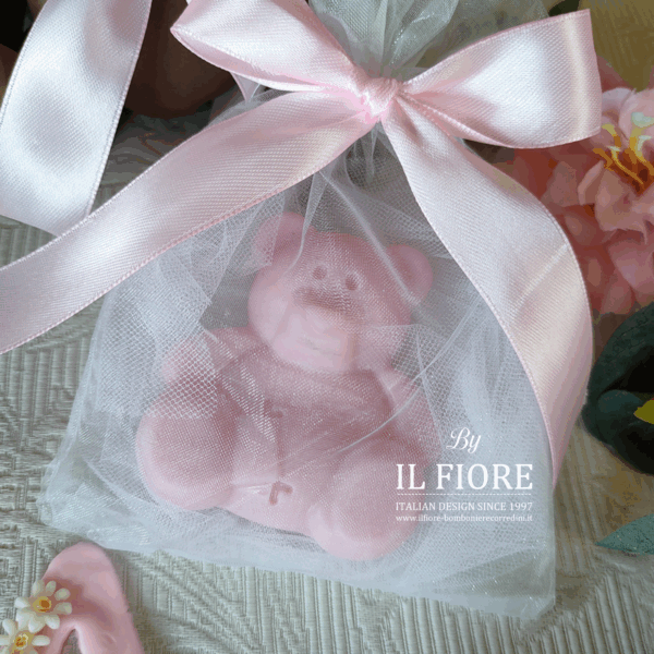 Bomboniera Battesimo candela decorativa orso. La bomboniera è confezionata con sacchetto in organza.