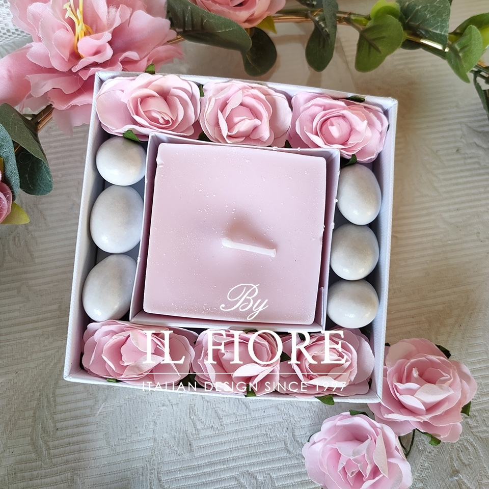 Bomboniera candela quadrata rosa o celeste con fiori, confetti cioccomandorla e bigliettino in omaggio.