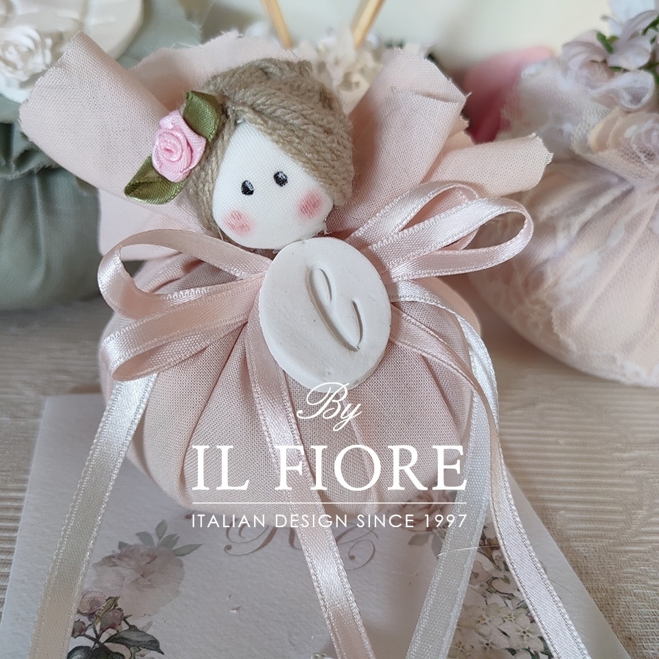 Bomboniera ciuffetto con testa bambolina e lettera personalizzabile per Battesimo.
