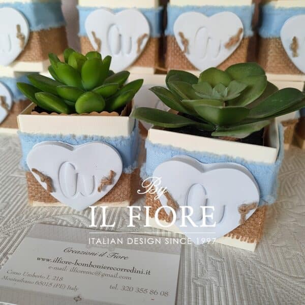 Bomboniera Battesimo bimba e bimbo con piantine grasse VERE e miste. La bomboniera è confezionata con scatola bianca e arricchita da un tessuto in juta, nastro in cotone e corda.