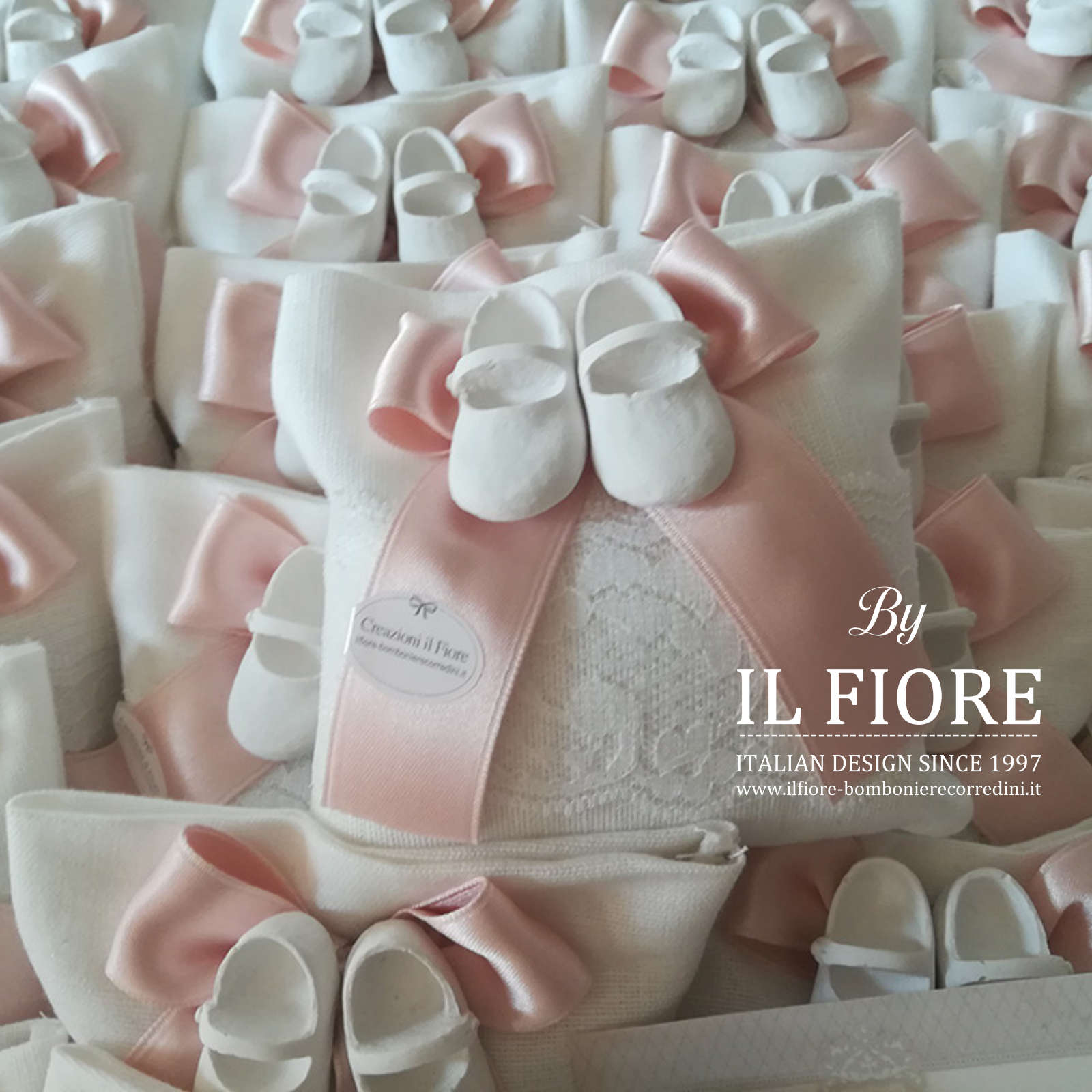 Bomboniere Battesimo con scarpette bimba e sacchetto con pizzo