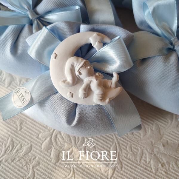 Bomboniera Battesimo BIMBO E BIMBA luna con folletto in gesso profumato e sacchetto portaconfetti in tessuto.
