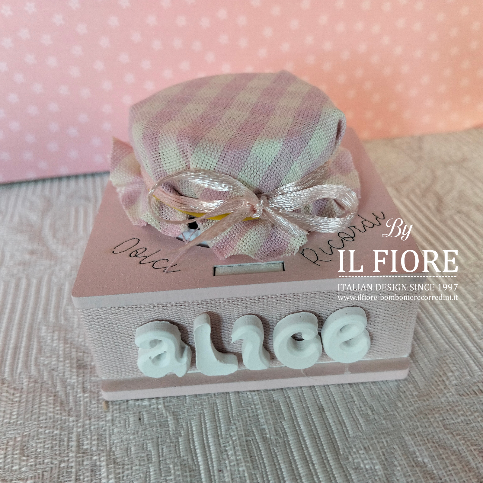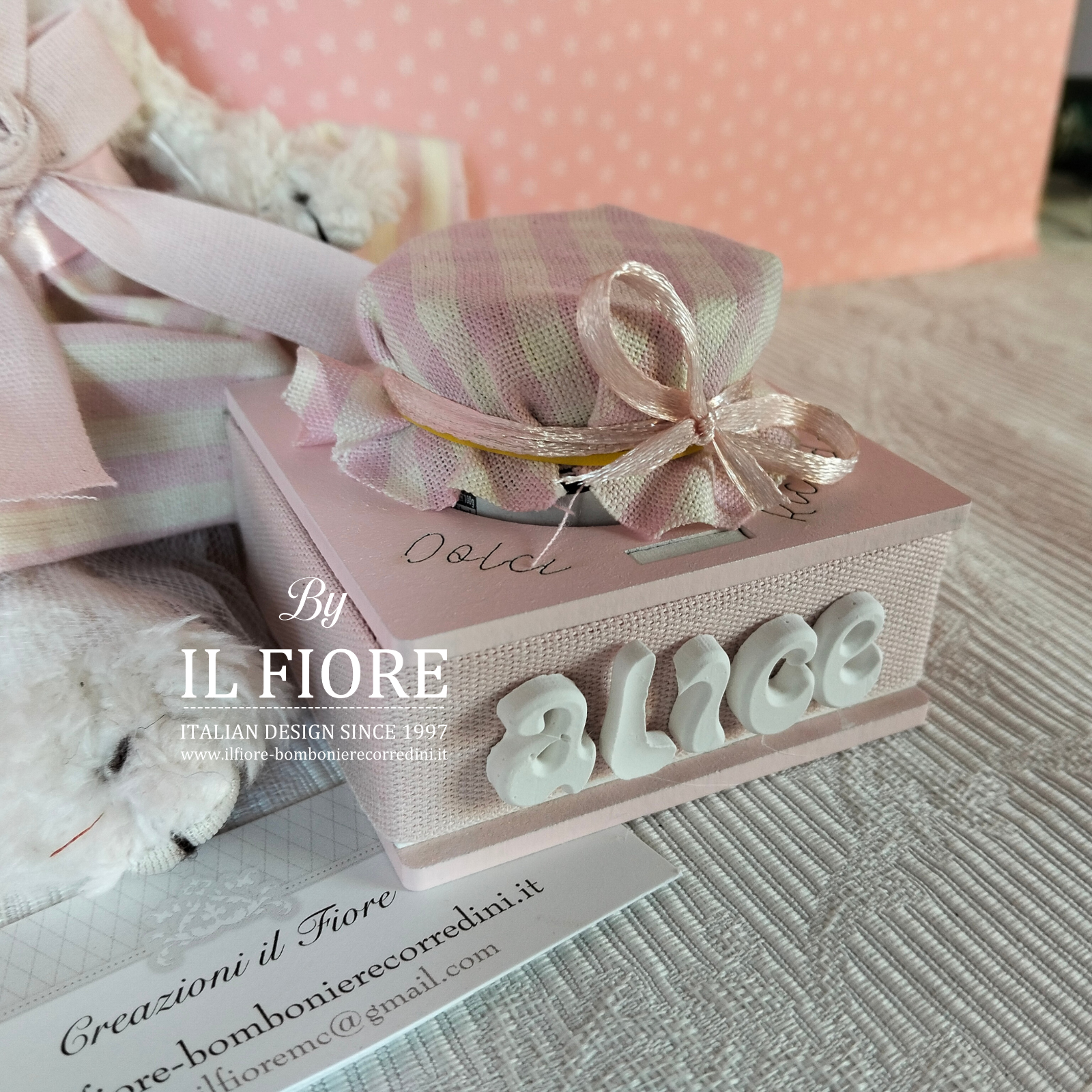 Bomboniera Battesimo BIMBO/BIMBA miele con scatolina in legno personalizzata con nome.
