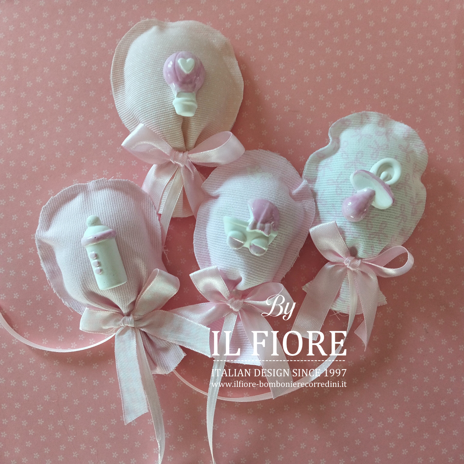 Bomboniere Battesimo palloncino sfrangiato bimba/bimbo con calamita, carrozzina, biberon, ciuccio e mongolfiera. Realizzata con stoffa piquet e fantasie diverse.