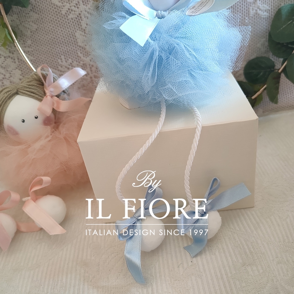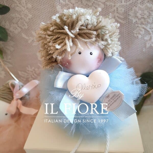 Bomboniera Battesimo bambola per bimbo in tulle azzurro personalizzabile con cuore in gesso, confezionata con scatola, fiocco di raso e confetti alla mandorla.