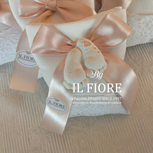 Bomboniera Battesimo bimba/o sacchetto con pizzo, decorato con calamita piedini.