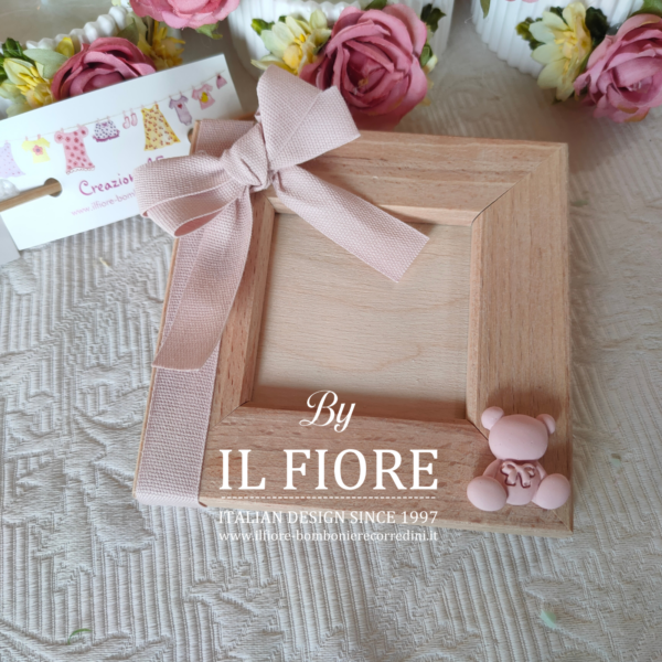 Bomboniera per Battesimo portafoto in legno con gessetto profumato a forma di orsetti e fiocco.