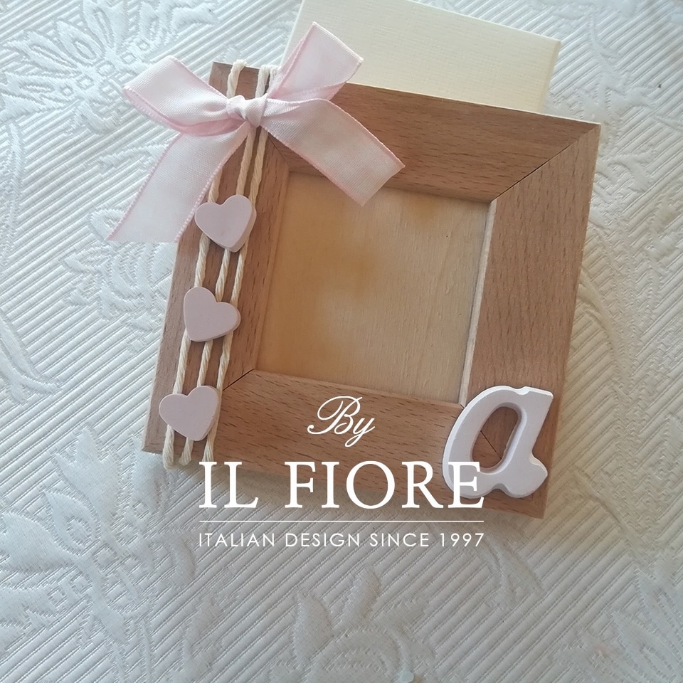 Bomboniera per Battesimo portafoto cuori e lettera in gesso profumato e nastro rosa o celeste.