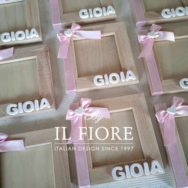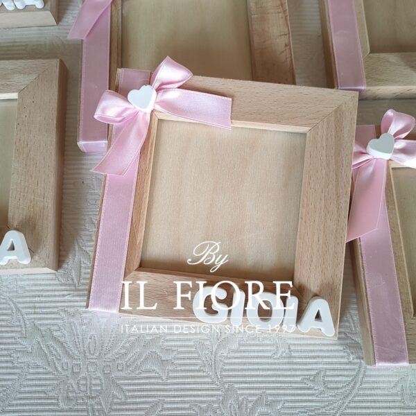 Bomboniera per Battesimo portafoto in legno con nome in gesso profumato e nastro di raso rosa o celeste.