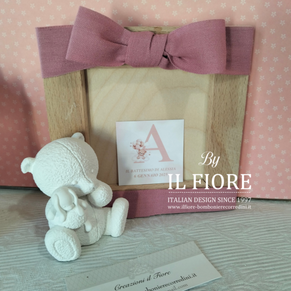 Bomboniera per Battesimo portafoto in legno, decorato con orsetto in gesso profumato e fiocco.