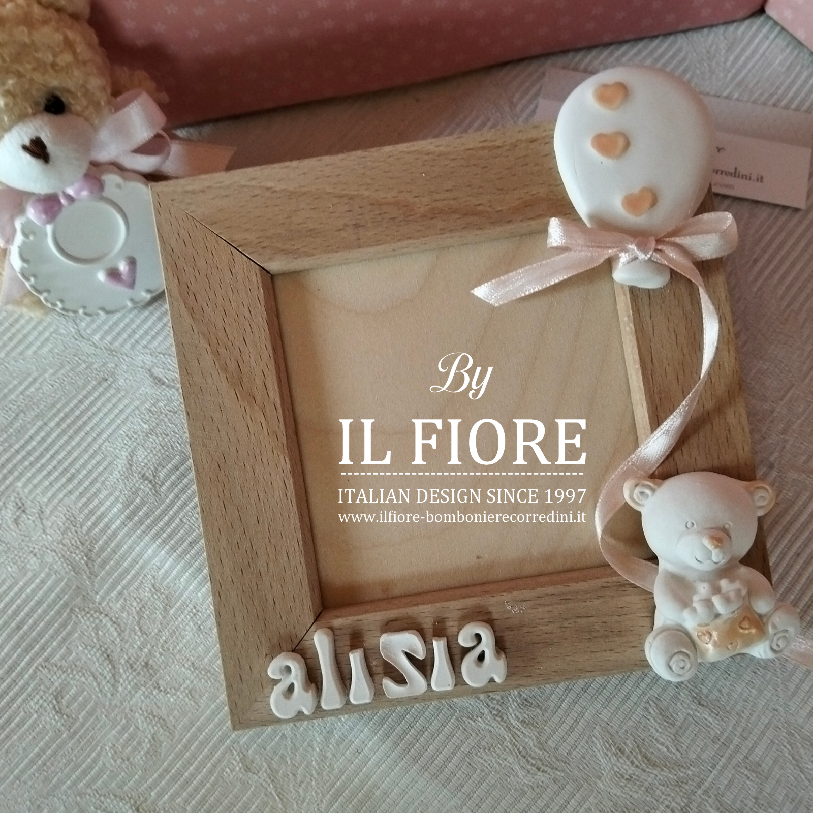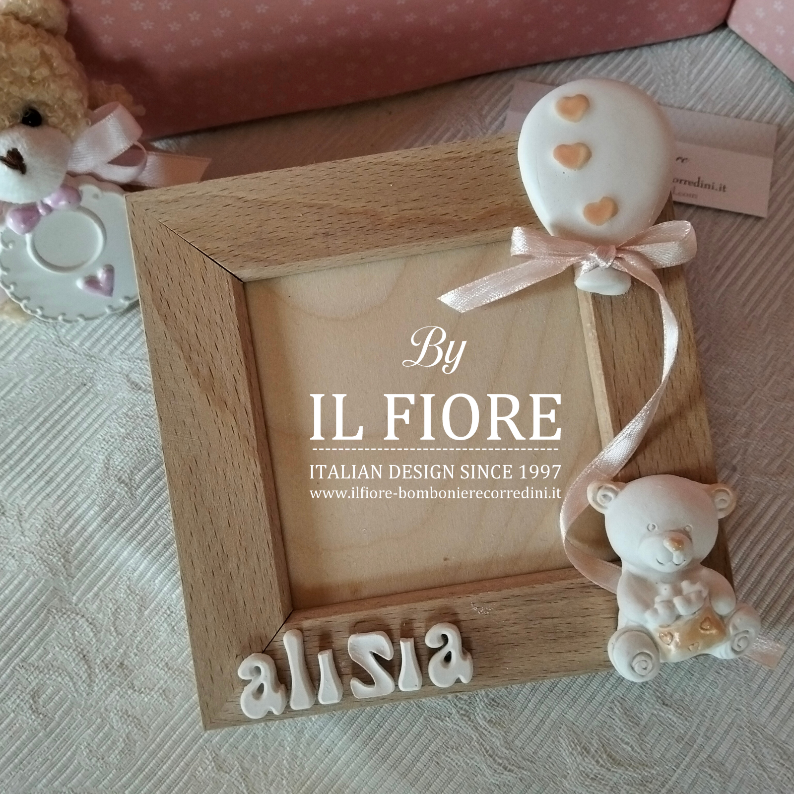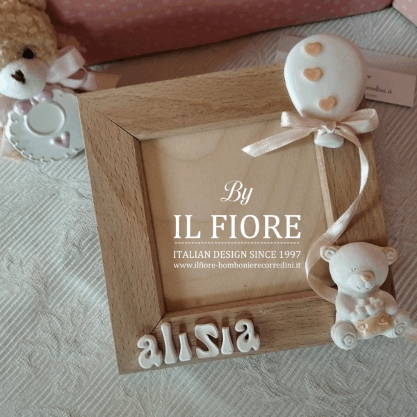 Bomboniera per Battesimo bimba o bimbo, portafoto decorato con orsetto, palloncino e personalizzato con nome.