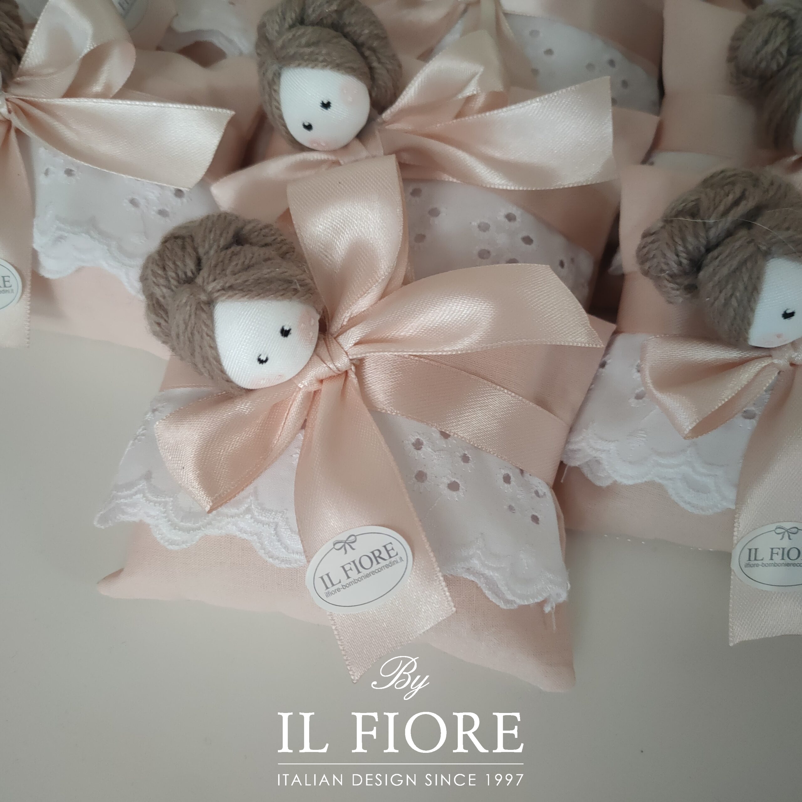 Bomboniere Battesimo sacchetto con merletto in Sangallo con bambolina