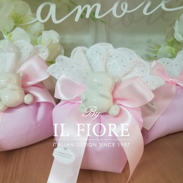 Bomboniere Battesimo Sacchetto Portaconfetti con orso in gesso e calamita.