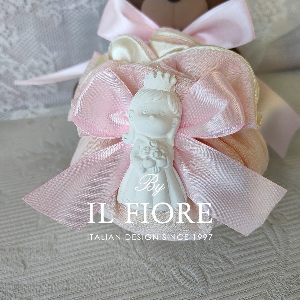 Bomboniera Battesimo sacchetto bonbon rosa, decorata con Principessa in gesso profumato.