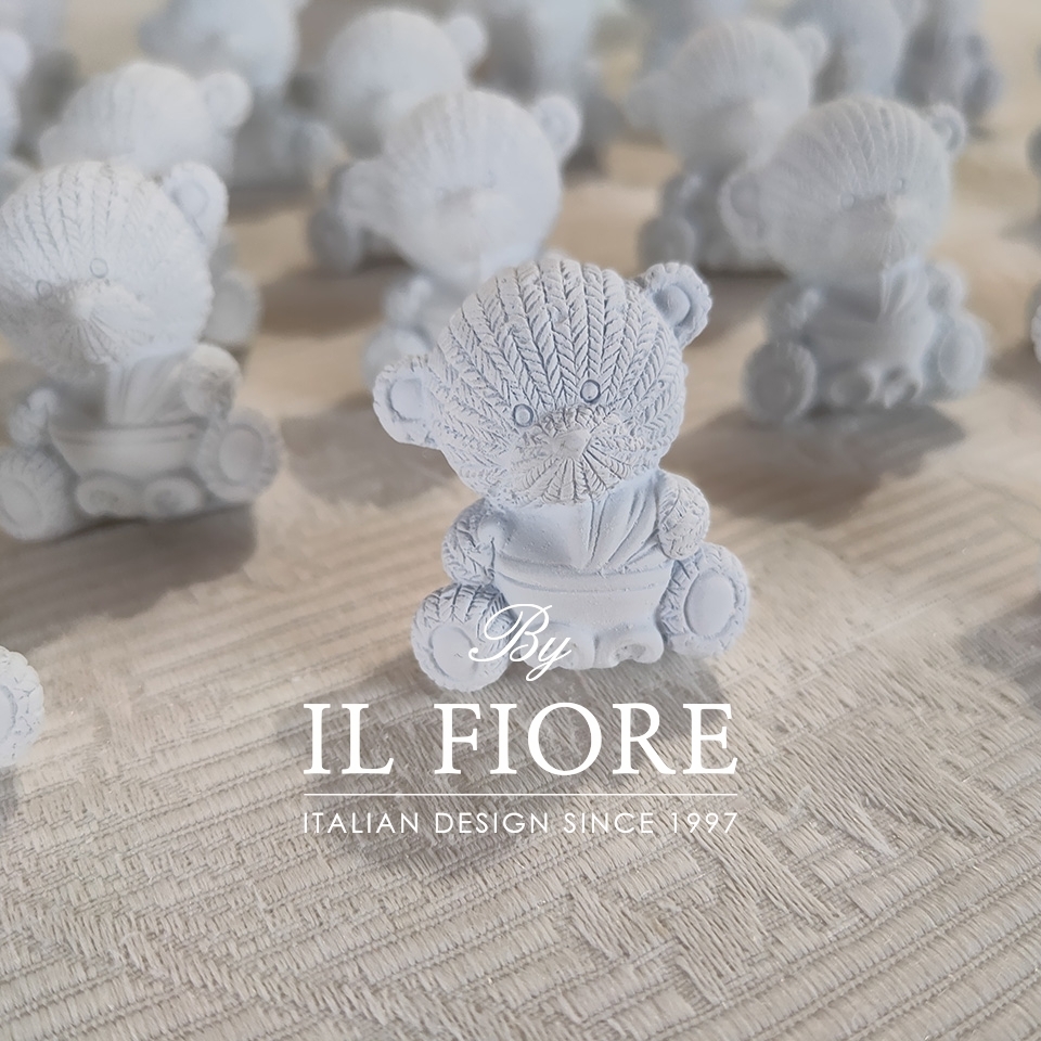 Bomboniera saponetta per bimba e bimbo con orsetto in gesso e tag personalizzata.