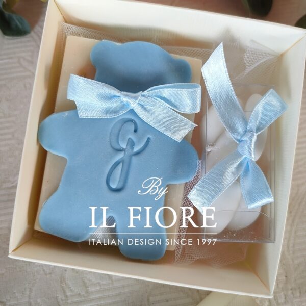 Bomboniera Battesimo saponetta per bimba e bimbo con orsetto personalizzabile con lettera. La bomboniera è confezionata con scatola, cinque confetti alla mandorla, nastro di raso e tag personalizzabile con nome e data cerimonia.
