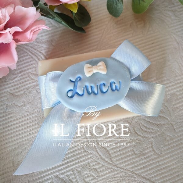 Bomboniera saponetta per bimba e bimbo con targhetta personalizzata. La bomboniera è confezionata con scatola, cinque confetti alla mandorla, nastro di raso e bigliettino in omaggio.