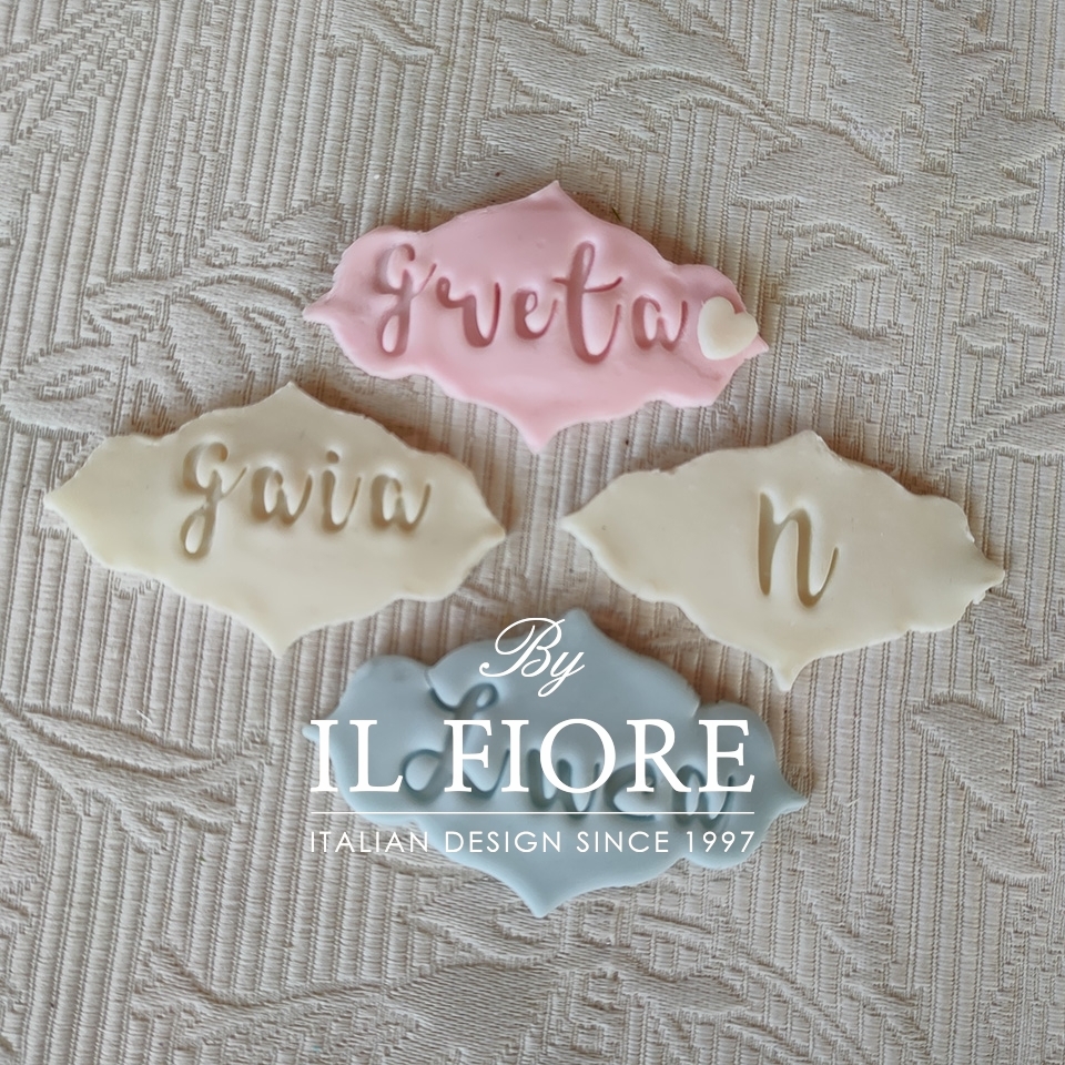 N.B. Nella targhetta si possono mettere nomi con massimo 5 lettere, altrimenti sarà decorata con lettera del nome come nella foto dimostrativa.