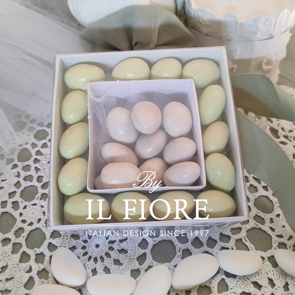 Bomboniera Comunione e Cresima, scatola portaconfetti quadrata con confettata  cioccomandorla e mandorla, bigliettino in omaggio.