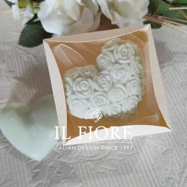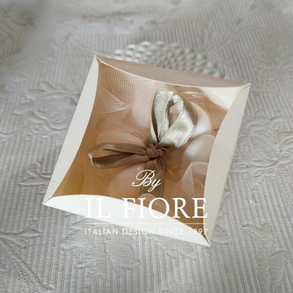 La bomboniera è confezionata con scatola e nastro di raso e due tipi di cuore con rosa e liscio. La scatola peonia è solo un esempio della confezione chiusa.