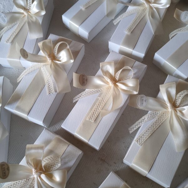 La bomboniera è confezionata con 2 tipi di candele, 5 confetti alla mandorla che sarà inserita nella scatola e biglietto in omaggio.