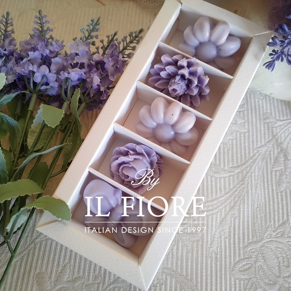 La bomboniera è confezionata con 4 candele, 5 confetti alla mandorla che sarà inserita nella scatole nello scomparto centrale, scatola decorata con fiocco.