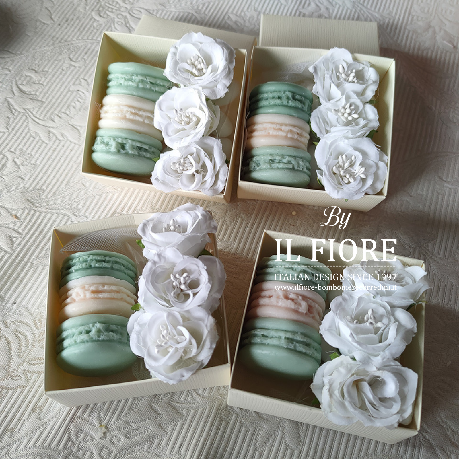 Bomboniera candele decorativa macarons e fiori per matrimonio, Comunione, Cresima e anniversario matrimonio.