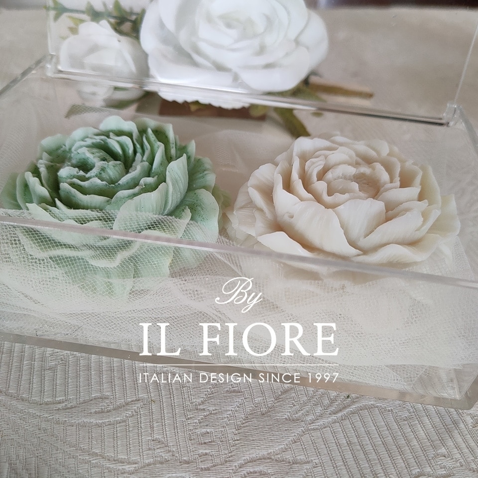 Bomboniera candele decorative peonia bianca e verde salvia per matrimonio, Comunione, Cresima e anniversario matrimonio.