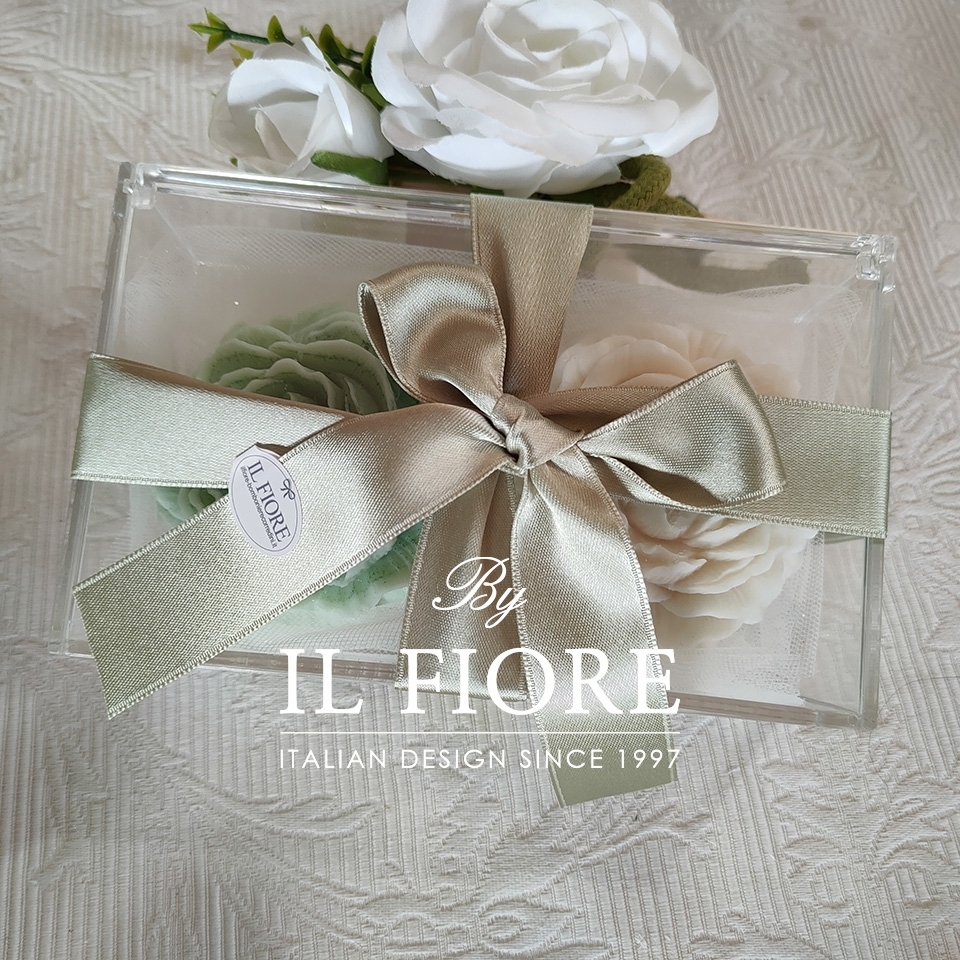 La bomboniera è  con confezionata con scatola in plexiglass, fiocco e tulle.