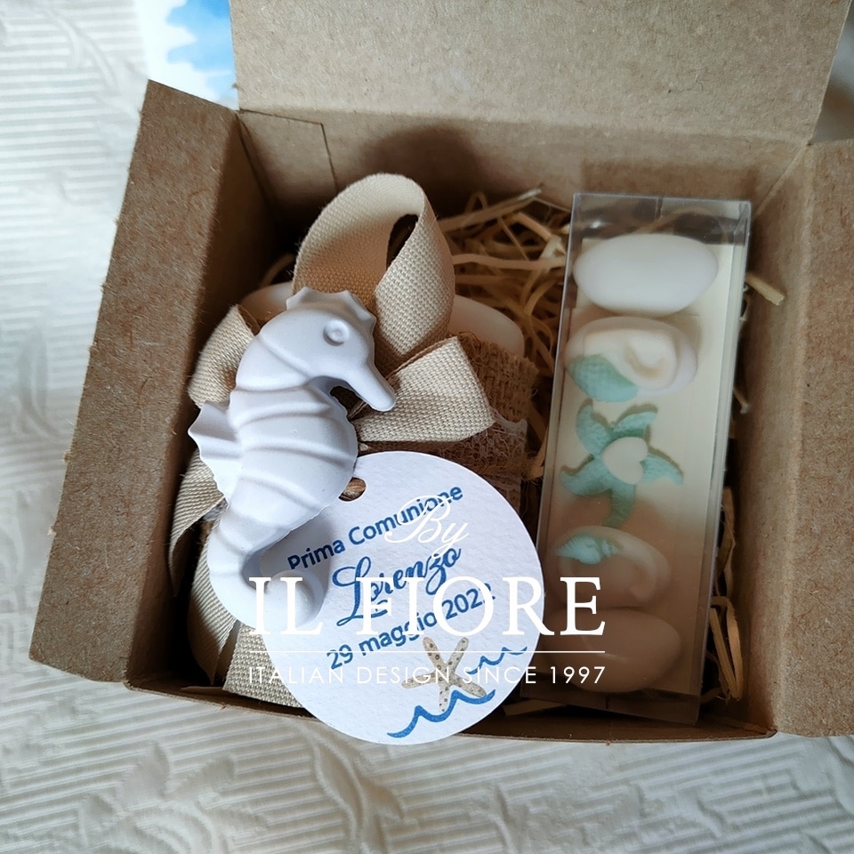 Bomboniera candela per Comunione, Matrimonio, Cresima e anniversario matrimonio, decorata con juta e gessetti profumati di colore bianco, stella marina, cavalluccio marino E conchiglia.