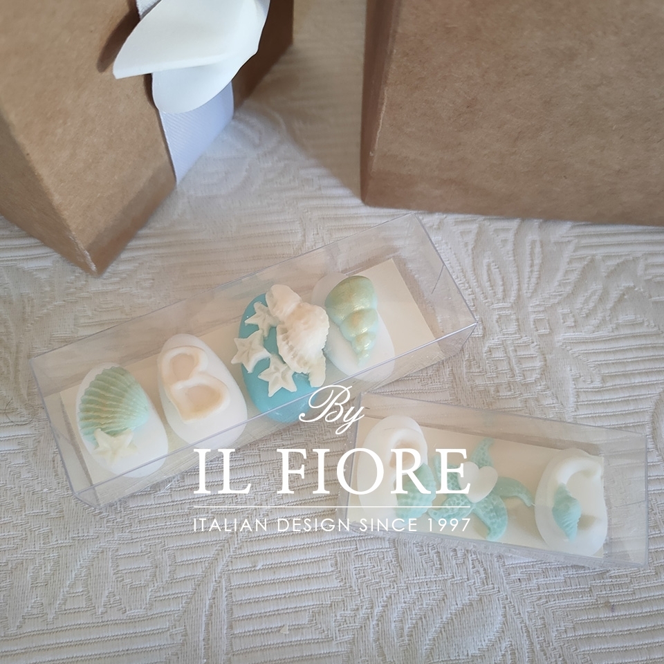 Candela piccola cm 7 confezionata con scatola e confetti decorati con iniziali € 13,50