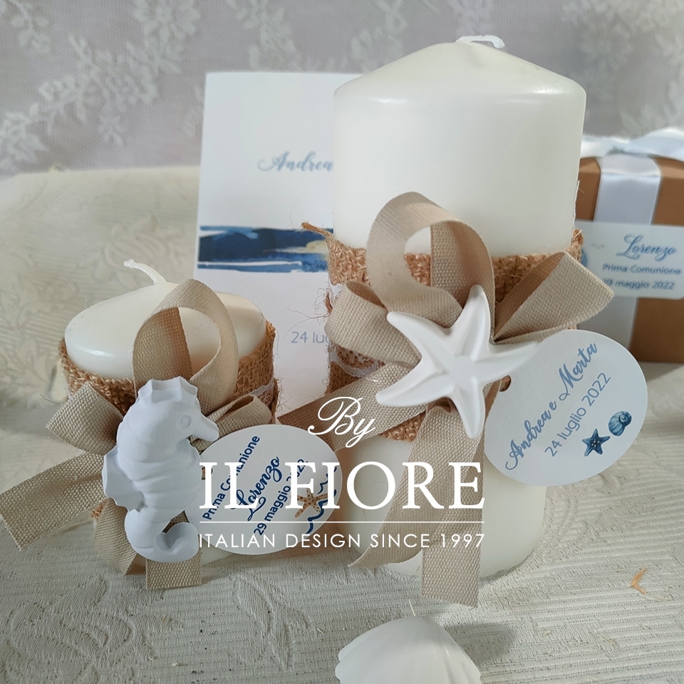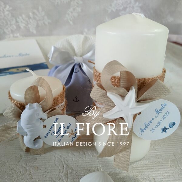 Bomboniera candela per Comunione, Matrimonio, Cresima e anniversario matrimonio, decorata con juta e gessetti profumati di colore bianco, stella marina, cavalluccio marino, conchiglia e pesciolini. N.B. La tag non è più disponibile.